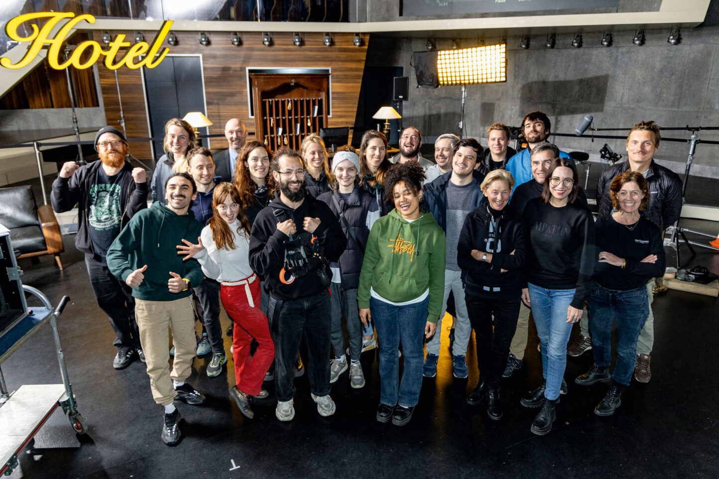 Die Setmitarbeiter*innen stellten zunächst ihre Berufe und Aufgaben vor und motivierten die Besucher*innen dazu, sie an der Kamera, beim Licht, beim Ton, bei der Script Continuity, der Ausstattung etc. zu unterstützen. Das Konzept ging auf – teilweise wirkten bis zu 80 Jugendliche gleichzeitig mit.